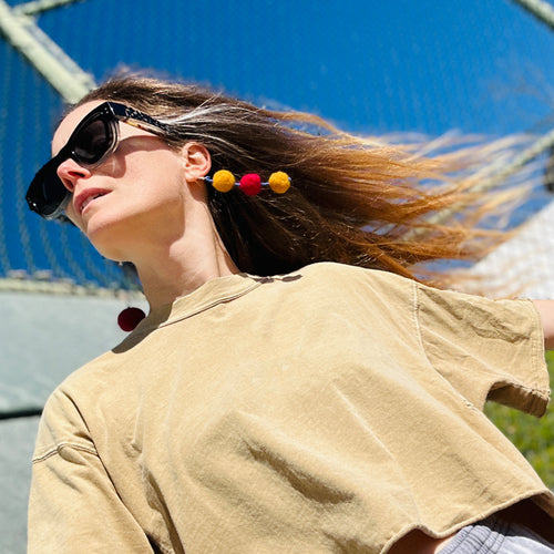 We celebrate the handmade and the slightly weird parts of being human. Everything here is built with real objects, moved by real hands, imperfect by design. The pom-pom earrings embrace the same idea—different, playful, and beautifully unpolished.